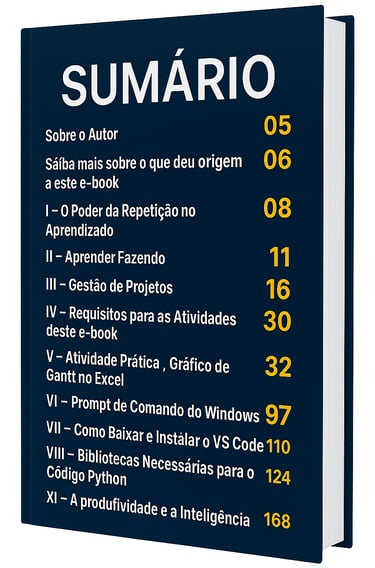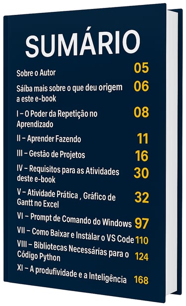 E-book com 175 páginas no formato PDF. Muitas atividades práticas: Excel; ChatGPT; Python e VS Code